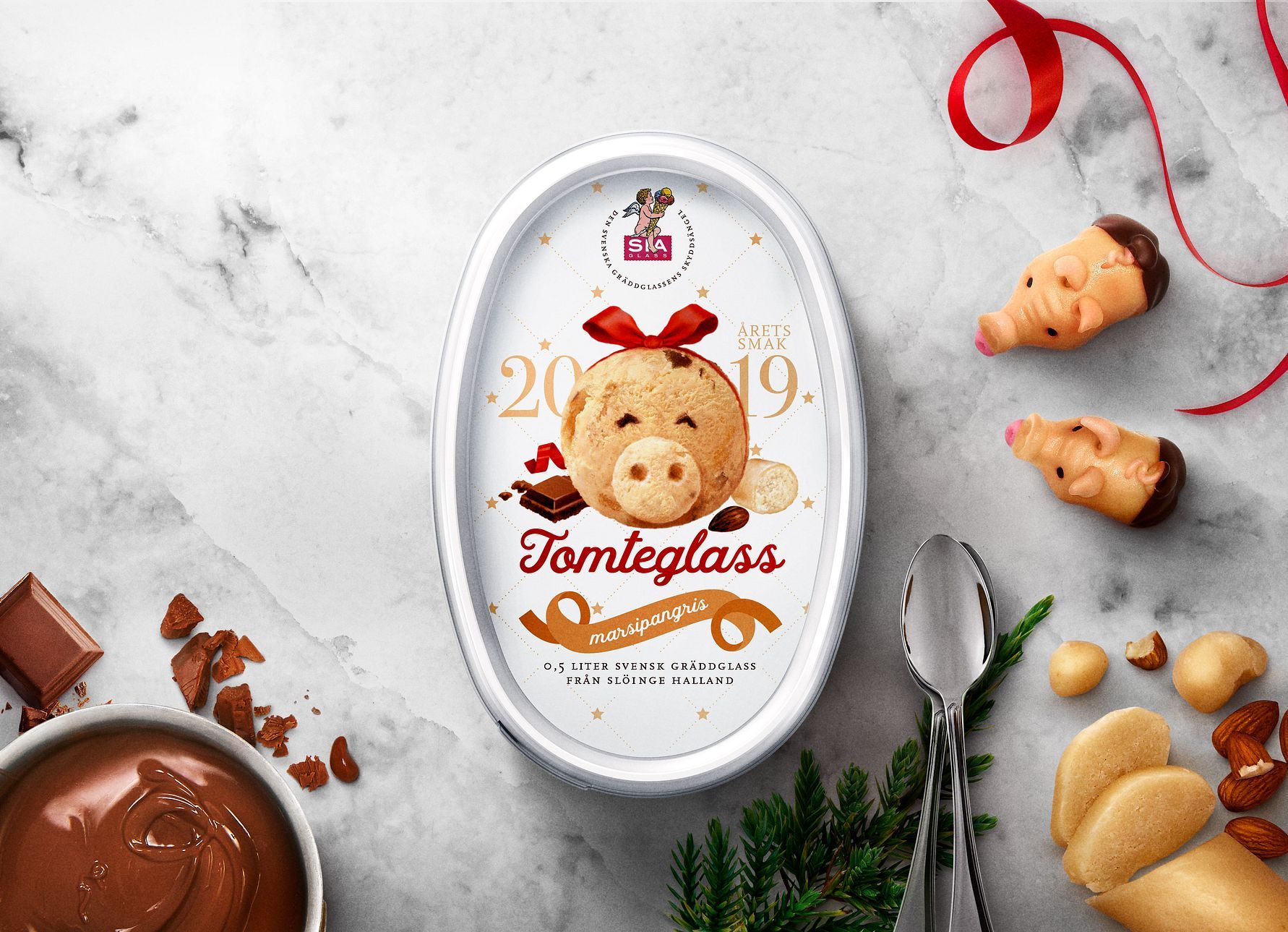 Sveriges äldsta familjeföretag SIA Glass håller på sina traditioner. För tredje året i rad har glassfabriken i halländska Slöinge producerat en Tomteglass av hög kvalitet. 2019 bjuder på en riktigt god marsipangris – av krämig gräddglass med slingor av marsipanrippel och chokladbitar. Alltid tillverkad i Sverige, alltid av svensk färsk grädde och garanterat godast på julbordet i år.