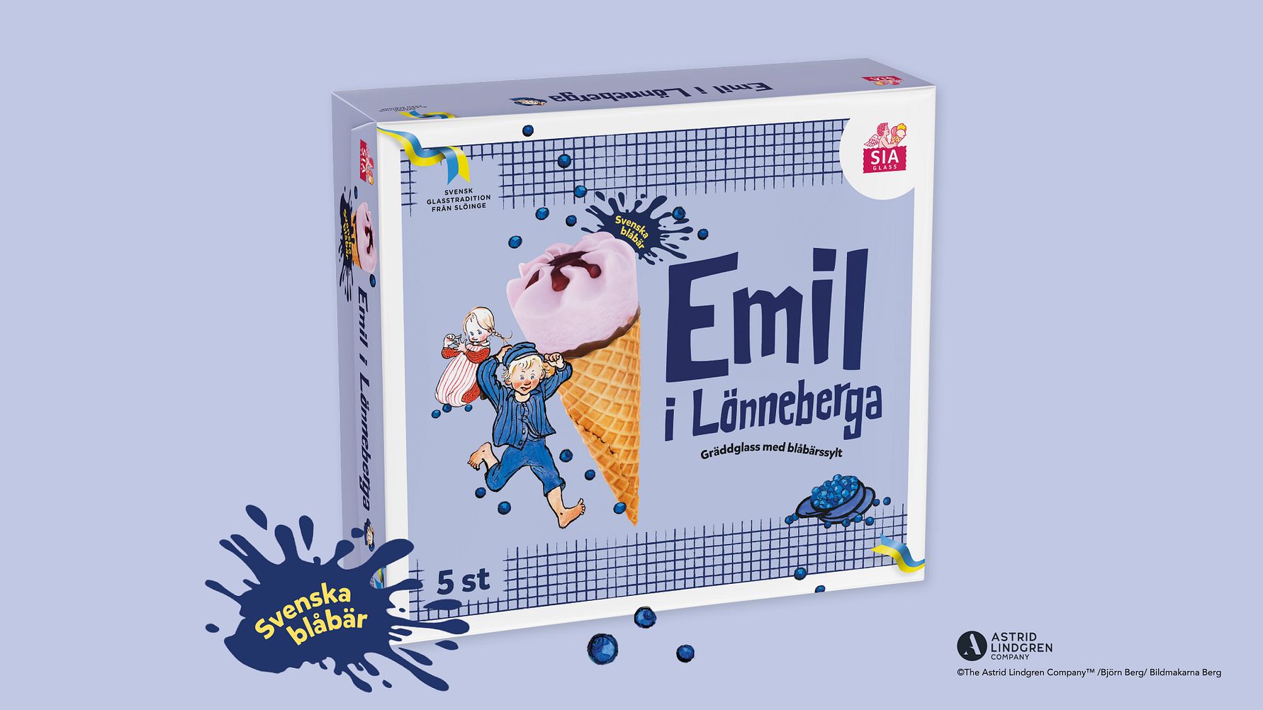 Emil i Lönneberga, Sveriges mest älskade unge, fyller 60 år i år, och vad vore bättre födelsedagspresent än en egen glass?SIA Glass lanserar nu glasstruten Emil i Lönneberga i flerpack. En busigt god glasstrut som görs av svensk färsk grädde med blåbärssylt. Glassen togs fram i samarbete med The Astrid Lindgren Company.