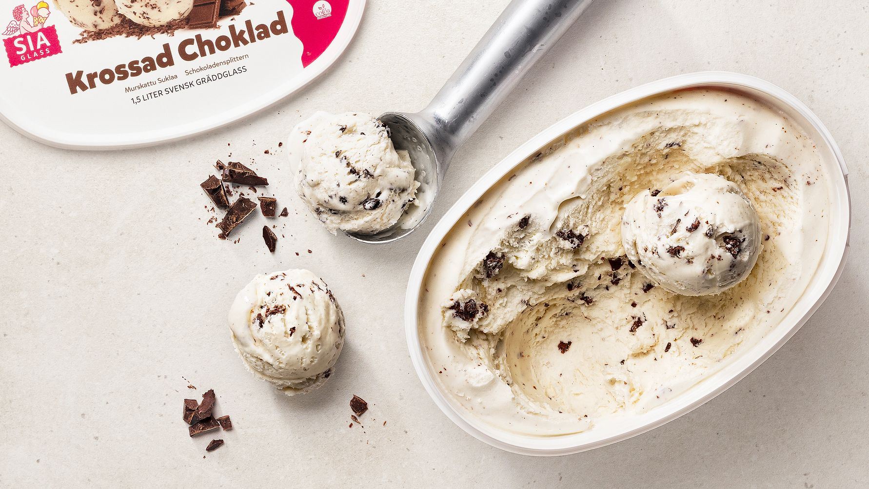 Nu introducerar SIA Glass därför Krossad Choklad, krämig gräddglass gjord på svensk färsk grädde med vaniljsmak och spröda chokladflingor.