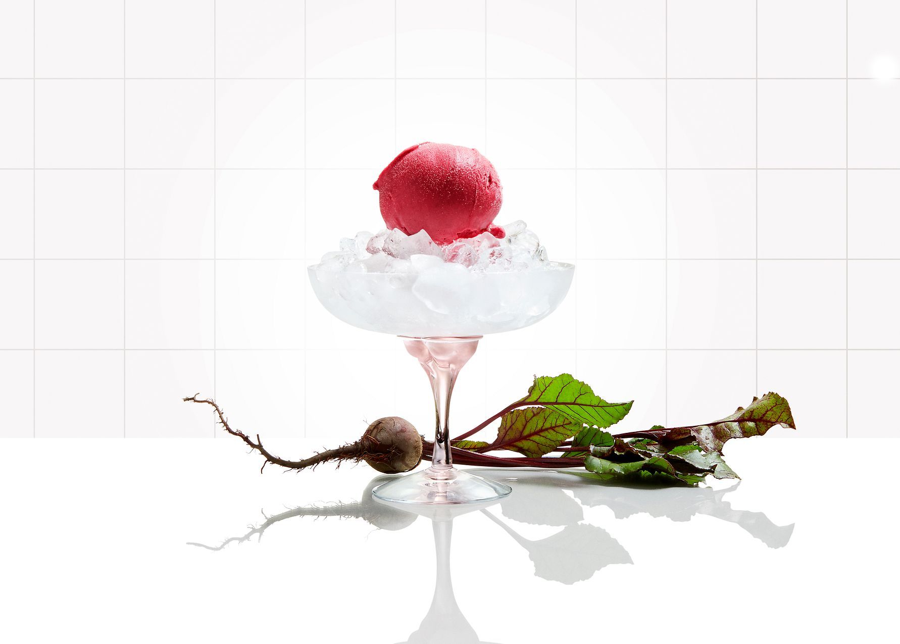 Färgstark rödbetssorbet med smak av timjan och svartpeppar. Ingår i SIA Glass restaurangsortiment. Som förrätt med blinier och gräddfil eller som en vågad shot mellan två rätter – en sorbetkula och en skvätt vodka.